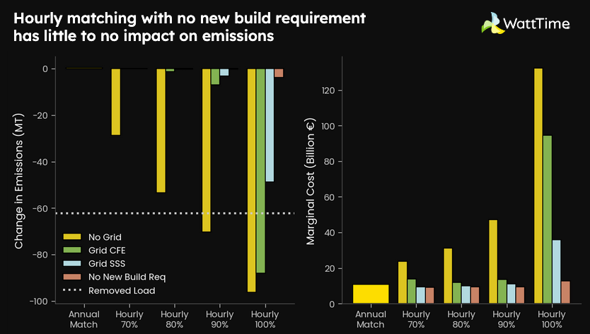 Previous studies have reported that hourly matching can reduce emissions, but almost all of them assume at least some level of additionality for the procured renewable resources. Only one work (Ricks et al. 2023) considered hourly matching without an additionality requirement, in the context of US hydrogen production, and found that without additionality “a 100% hourly matching requirement loses all of its consequential impact."
